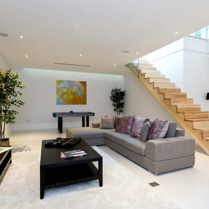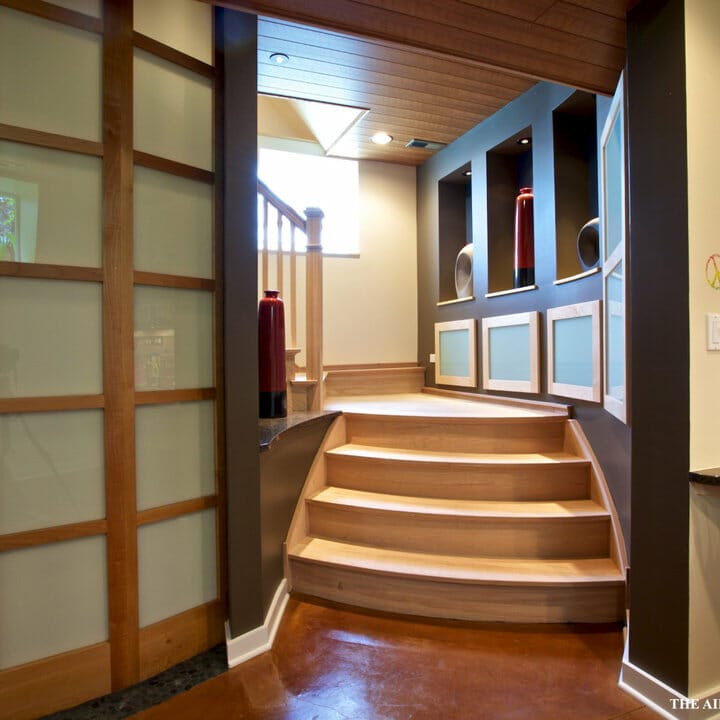 The arrangement of basement stairs is about aesthetical purpose and multi-functionality at once.