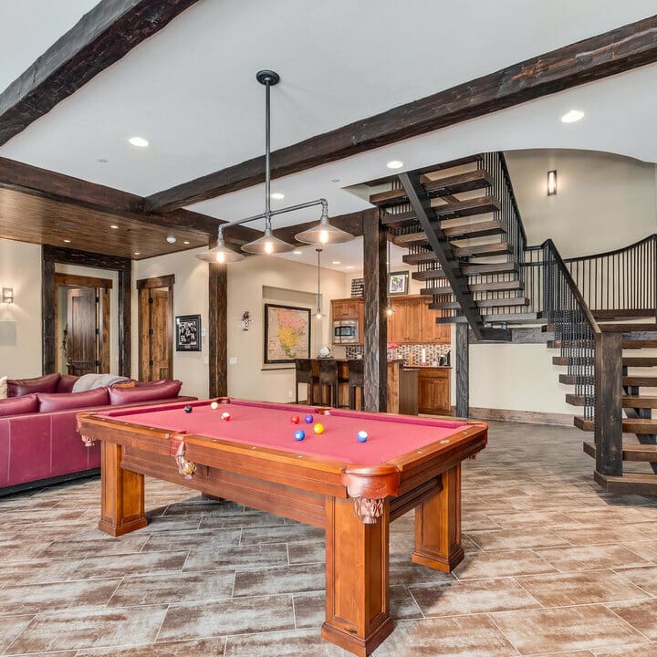 The rustic ambiance will be more robust in your basement game area by simultaneously providing wooden stairs with iron balusters as above.