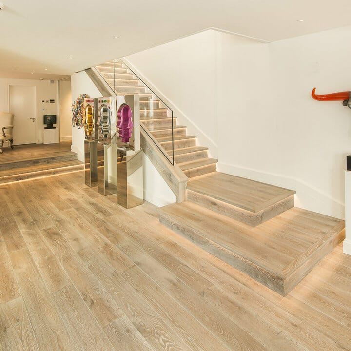 Instead of wall lighting, you can install lights right under your hardwood coverings.