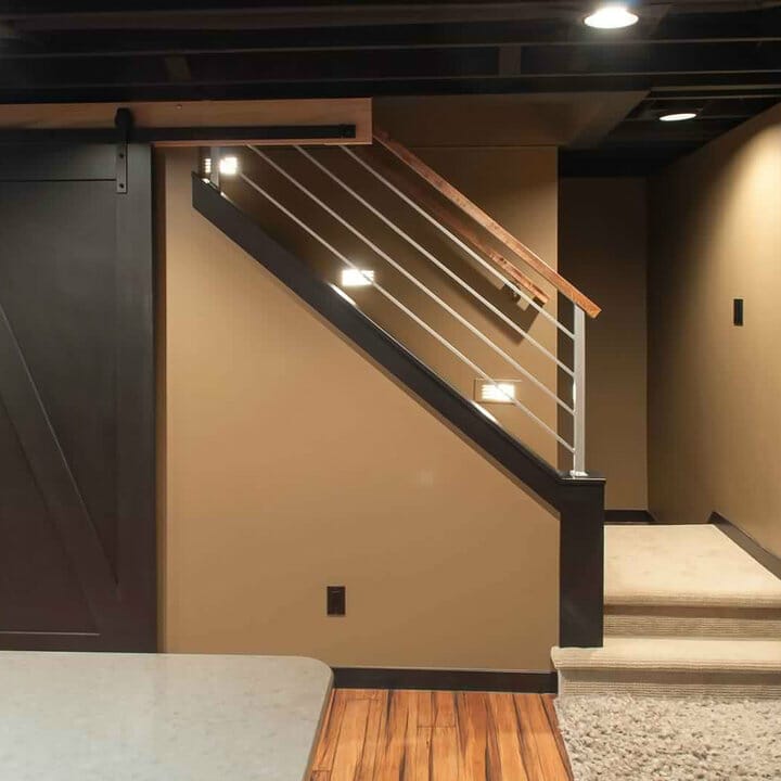 Giving it its actual color like grey with a horizontal cable railing on only one side will make your basement have a strong industrial feel.