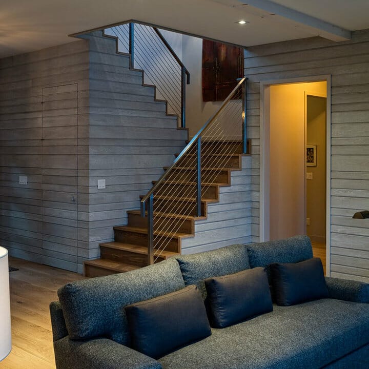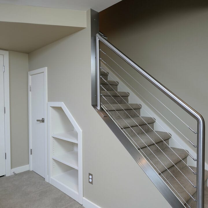 In addition, this cable railing also acts as a partition between your basement sitting room and your staircase area, which obviously, is stunning.