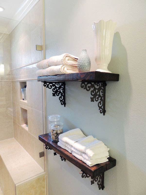 Does your bathroom crave traditional aesthetic? Create shelves using black iron brackets and stained reclaimed wood boards.