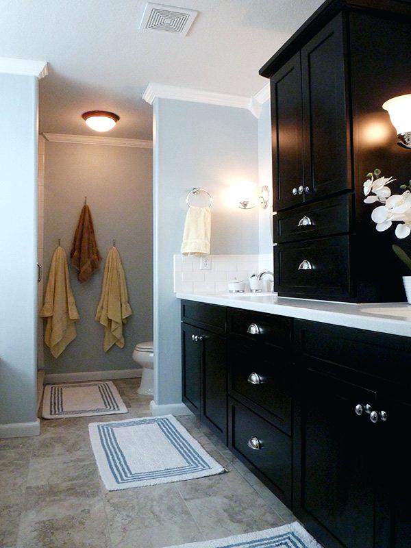 Black cabinets are a dramatic contrast to white sink and vanity top. They give the space generous storage capacity. Stainless steel rings and hooks are used to hang the towels on.