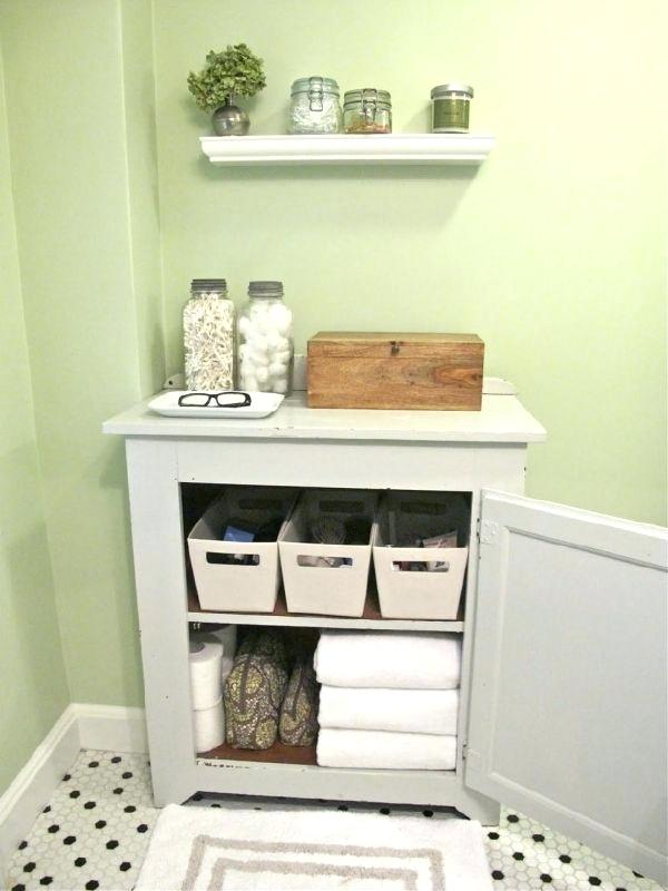 Above is a white freestanding cabinet. It does not take up too much of floor space since it is slender in design. White and green towels are put on the cabinet top. The cutout drawer pulls are easy to use.