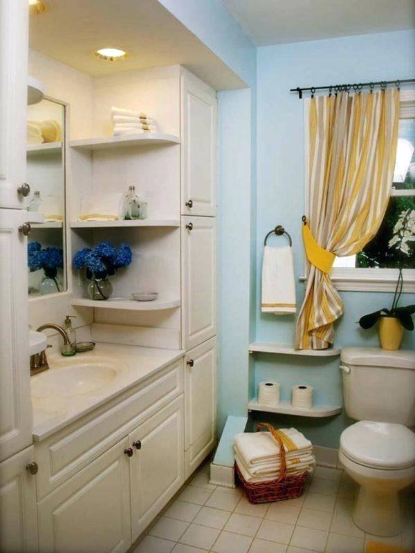 There is no wasted space in this small bathroom. The off-white built-in cabinets hide bulky items.