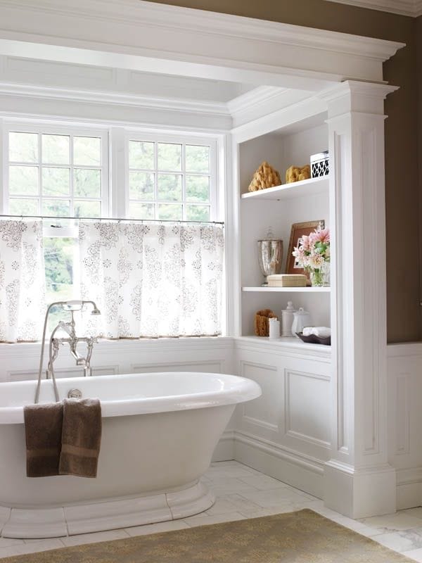 This contemporary bathroom looks bright and open, thanks to the white color scheme. Recessed shelves allow the homeowner to gain storage space inside her bathroom walls, while flowers titivate the area.