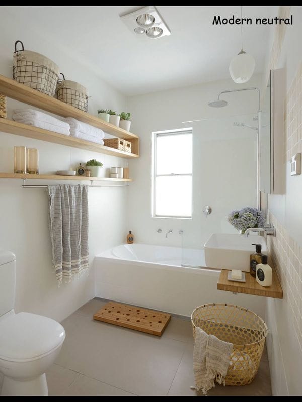 The handleless white cabinet underneath the sink introduces a sleek aesthetic. Three white open shelves showcase frequently used bath essentials. Lastly, the windowsill offers additional storage space in a tiny bathroom.