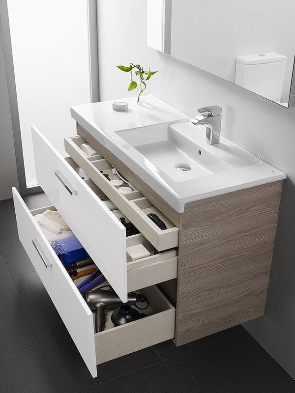 Moreover, it has drawers of different sizes. The bottom one is used to stash away hot styling tools.
