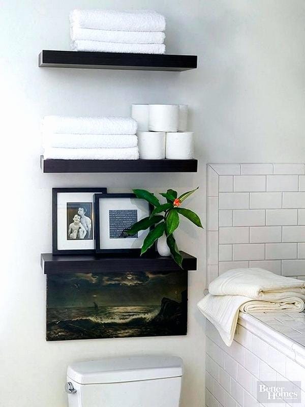 Do you have a small bathroom? It’s no problem. You can make use of your vertical space. Mount black open shelves on the white wall over the toilet.
