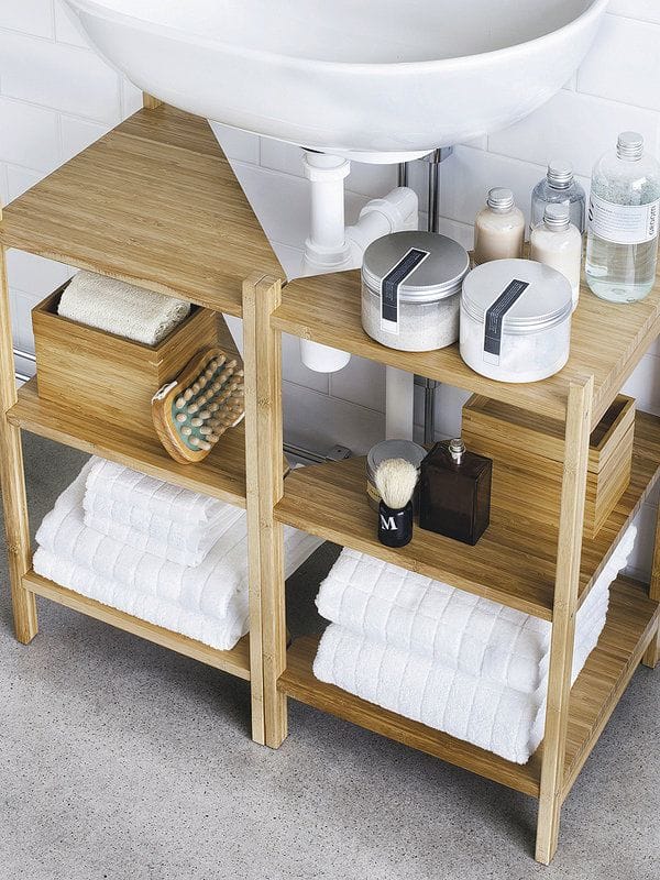Forgo the cabinets and arrange freestanding shelves from Walmart on the floor under your sink. Do they not only keep the mess at bay but also carve a crisp look and an airy scene.