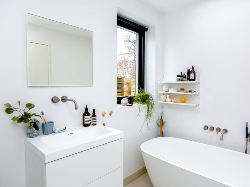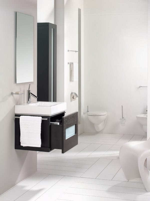 A slim white storage tower blends in effortlessly with the surrounding walls. It creates an airy environment too.