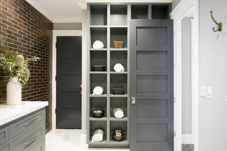 You never go wrong with floor-to-ceiling open cabinets. They are painted pastel gray to match the door and vanity. The rolled white towels, baskets, and bowls are stored in the cubbies. What a captivating display!
