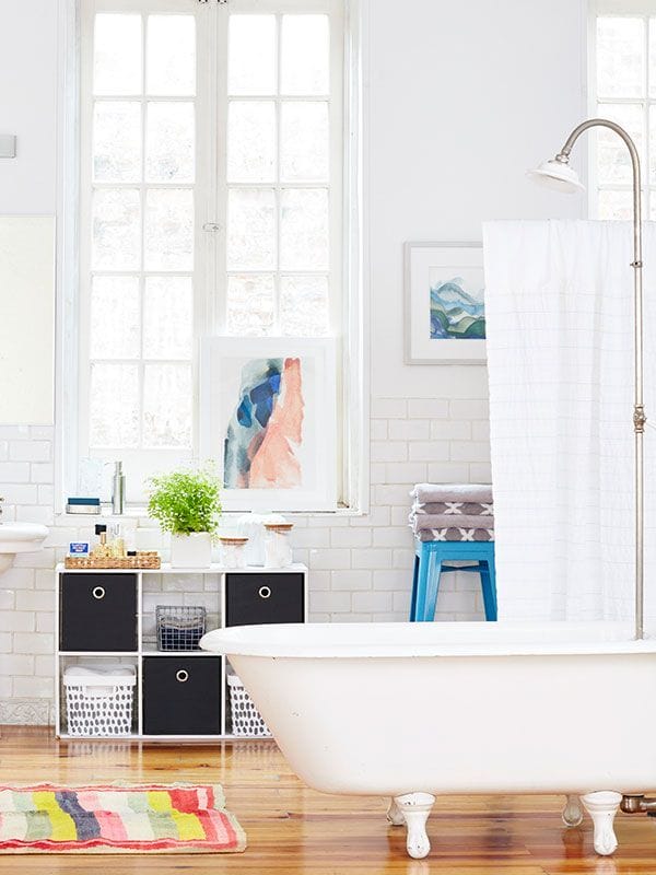 White open shelves from IKEA do not only make the bathroom organized, but also let the eye focus on the bright colors. Lidded woven wicker baskets hide eyesores and develop a farmhouse feel.