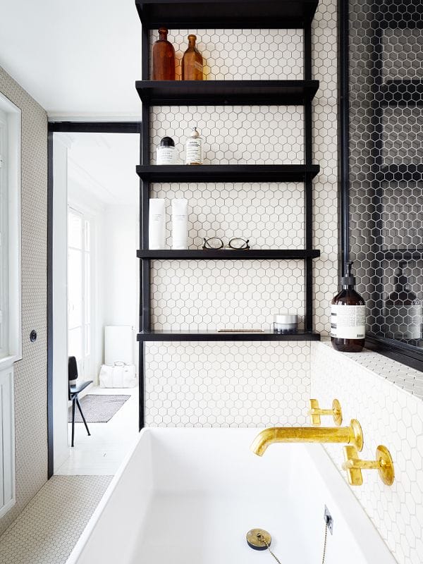 Black shelves stand out against white hexagon tiled backdrop. For sure, the homeowner, due to their inky shade, will not ignore them.