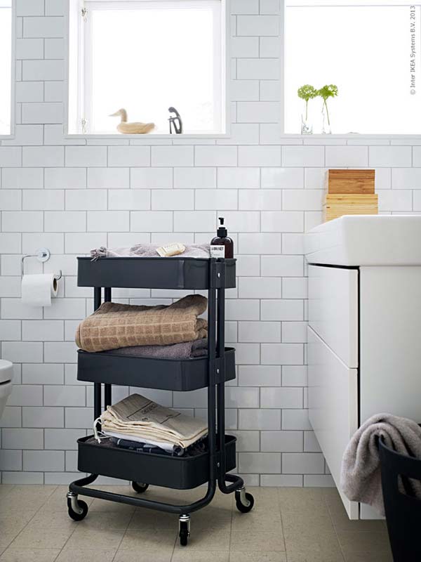 The black rolling cart keeps towels, linens, and bath essentials in place. It lends drama and industrial charm to the bathroom too.