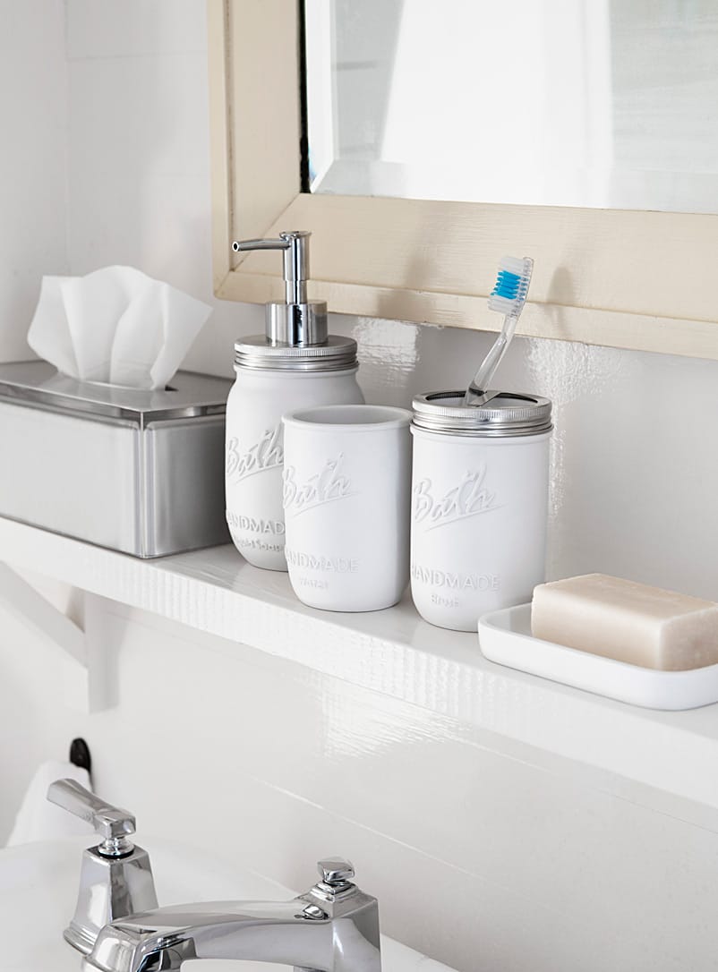 This white-painted Mason jar bathroom set is bought from Amazon. It invokes a farmhouse feel in a split second.