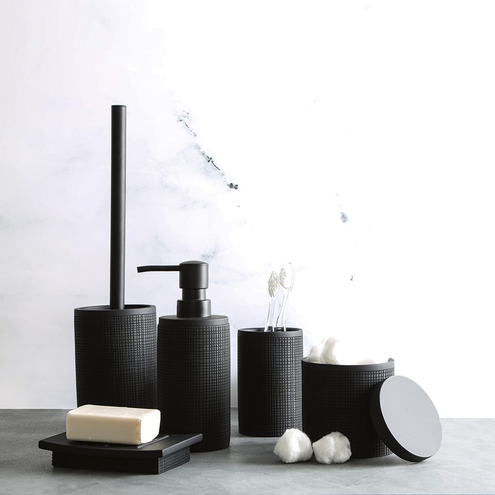 This bathing space is accessorized with black polyresin dispenser, cotton jar, soap dish, toilet brush holder, and tumbler. They bring texture and instant drama to the area.