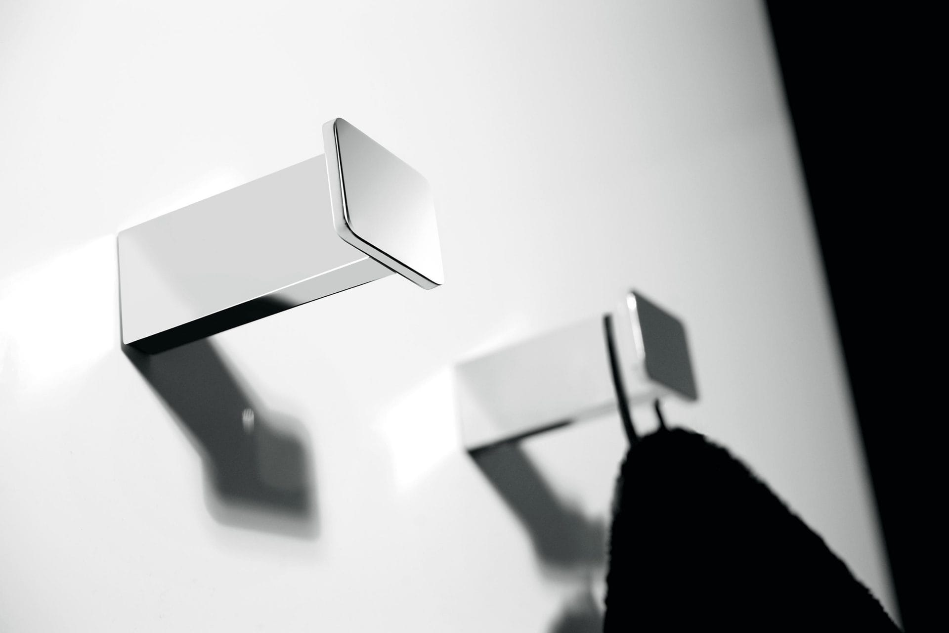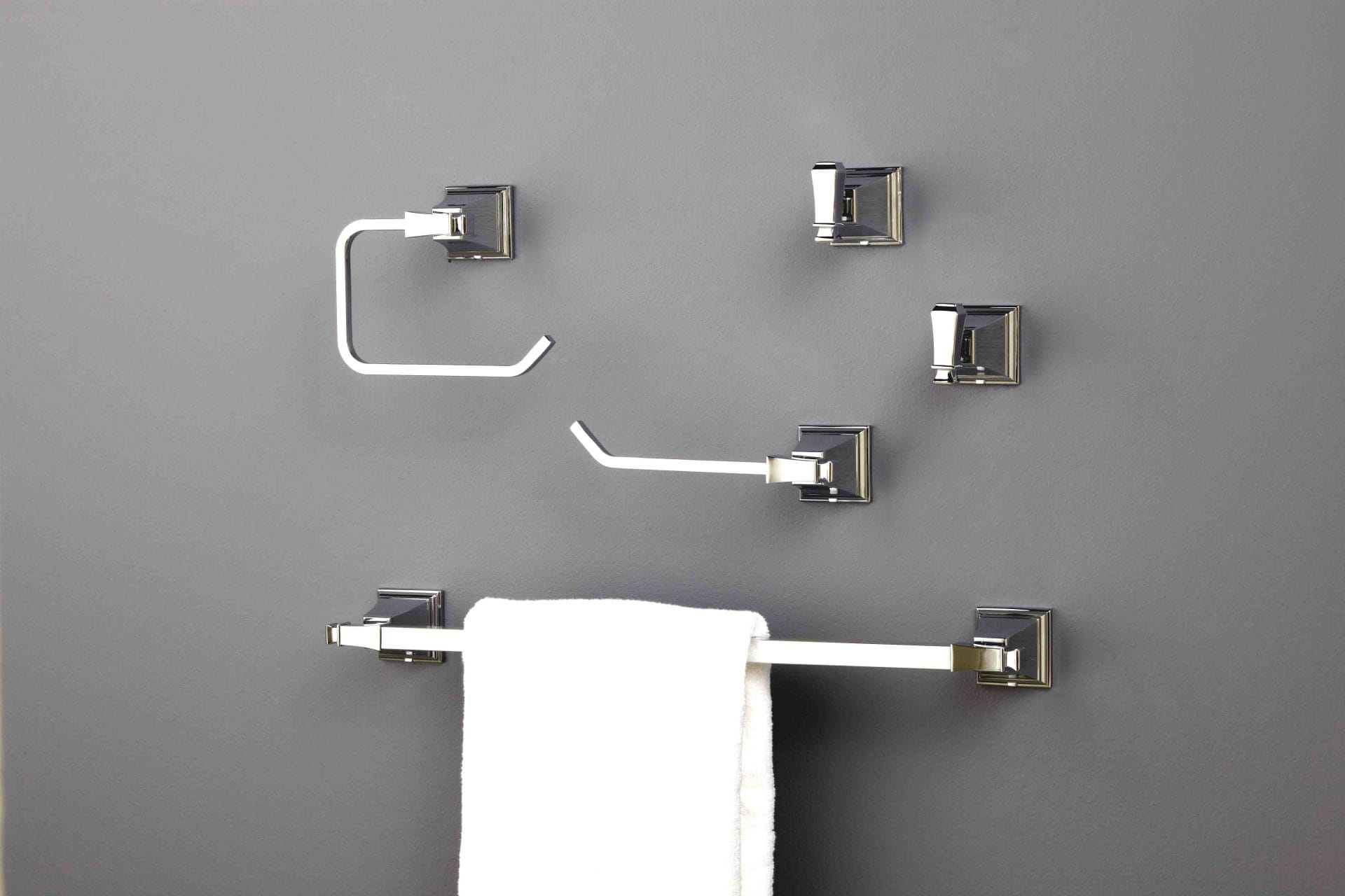 This chrome-plated ring hanger from IKEA keeps the soft gray towel off the bathroom floor. Since it has no visible screws, the space looks organized.