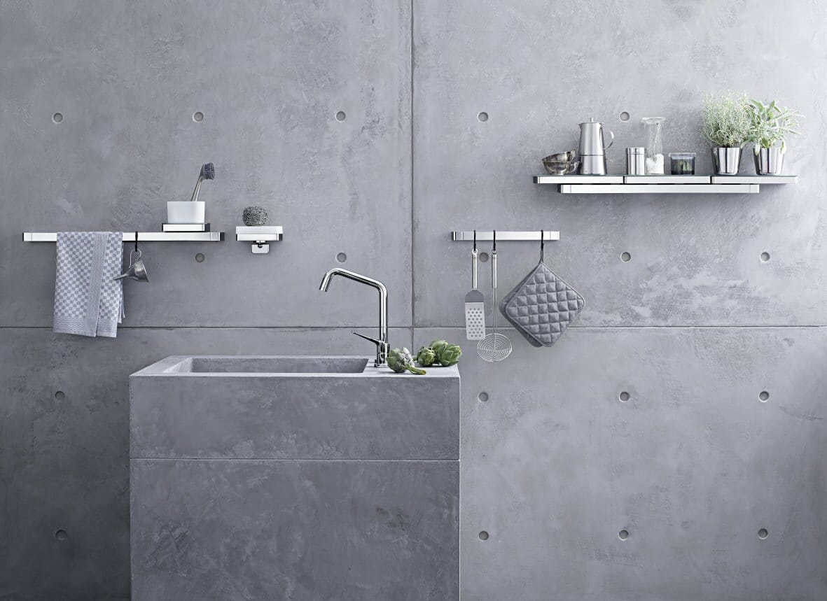 Concrete wall tiles offer a rough texture. Stainless-steel soap dispenser holder and hardware celebrate modern industrial design.
