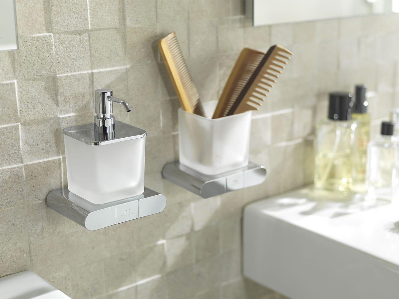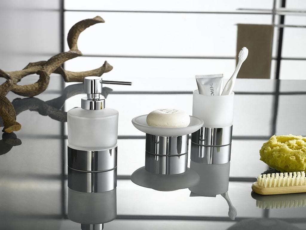 The minimalist metal bathroom gadgets support liquid soap dispenser and comb holder. They inject a dash of glam into the area as well.