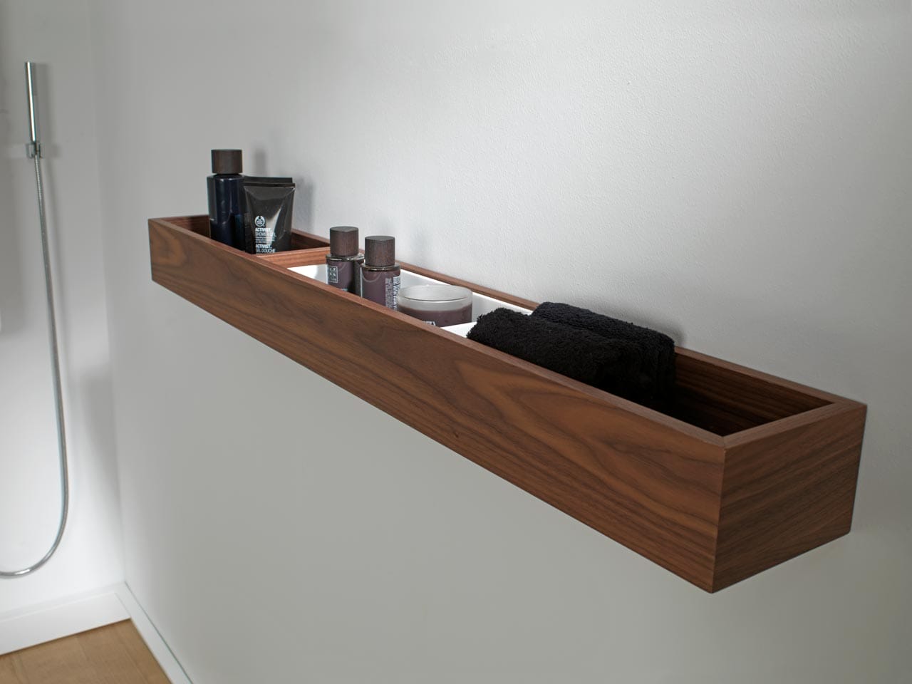 Are you living in an apartment? Steal this idea. The long wooden storage box has two fixed compartments. It holds bathroom essentials and hand towels.