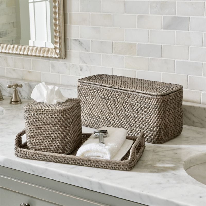Rattan tray provides space for a white towel and tissue box. Meanwhile, rattan storage box keeps some beauty stuff in place.