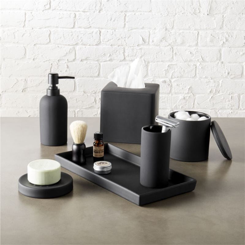 Metal tray, soap dish, liquid shampoo dispenser, razor holder, cotton ball organizer, and tissue box are painted matte black. They produce an industrial feel.