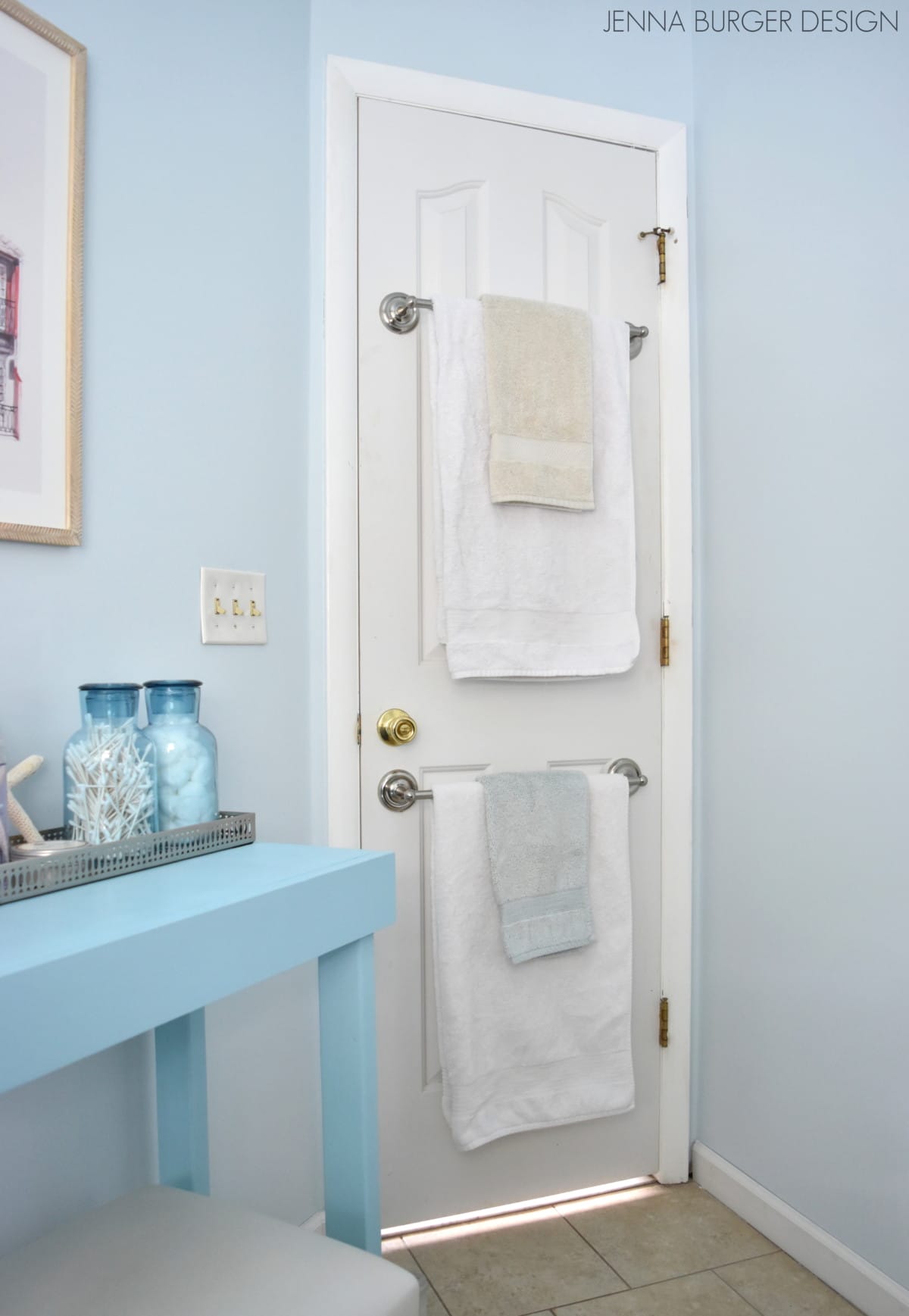 Two stainless-steel towel racks are mounted on the back of the white door. Do they not only provide ample storage space but also infuse luxe.