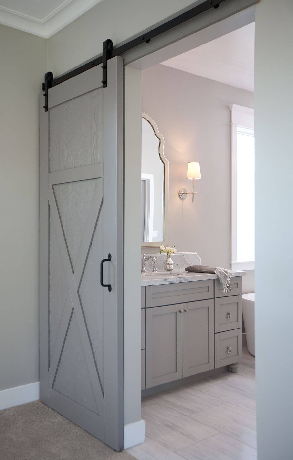 Light gray walls, white soaking tub, and base molding elicit the feeling of calmness. Medium gray-painted barn door is such a space-saving feature.
