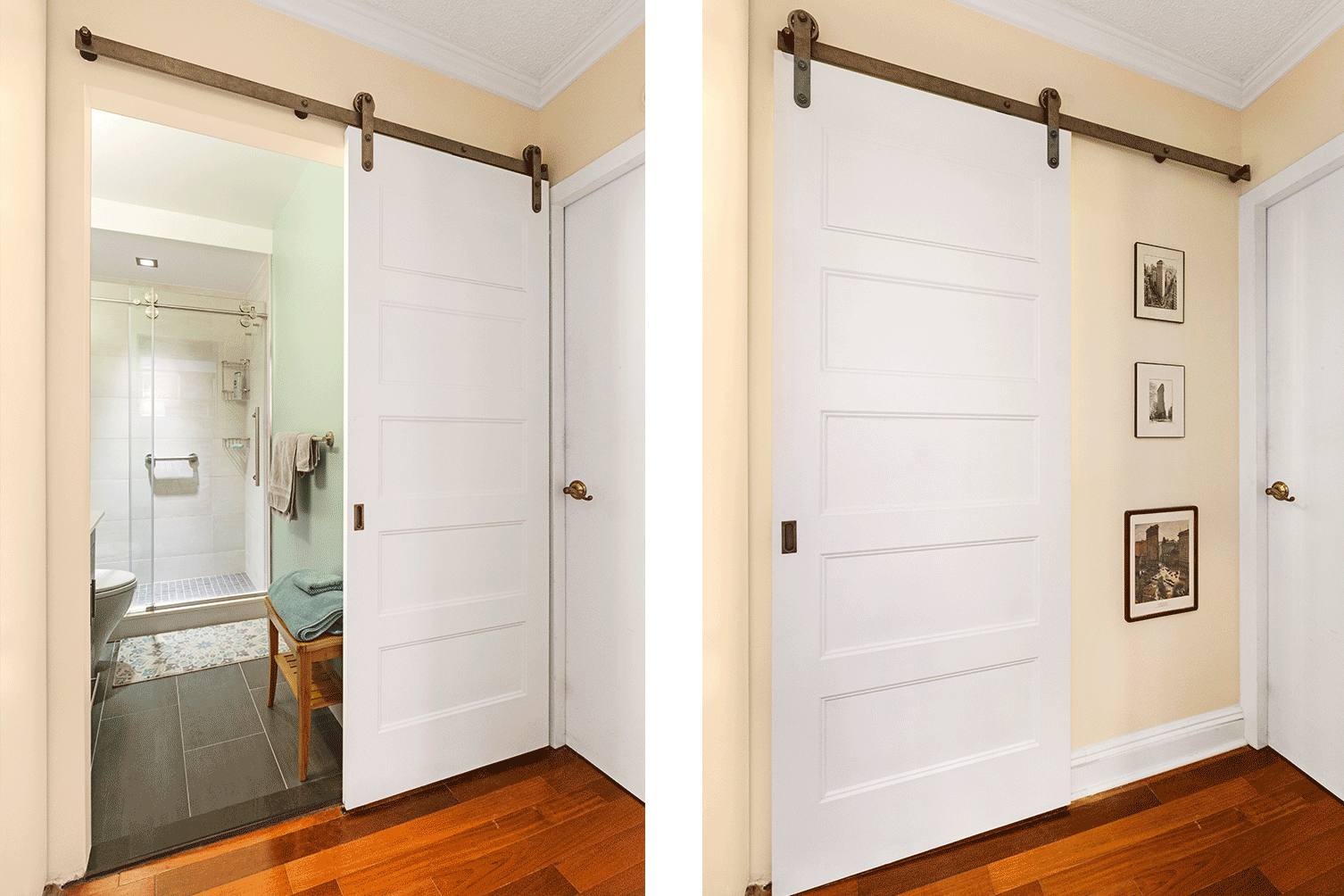 A light gray pocket door is both functional and stylish. Wooden floor counteracts the cool-toned door nicely.