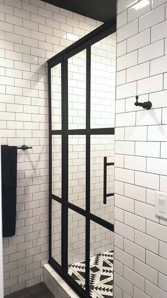 White subway tiles on the walls lend the bathroom a contemporary flair. Meanwhile, patterned floor tiles attract attention.
