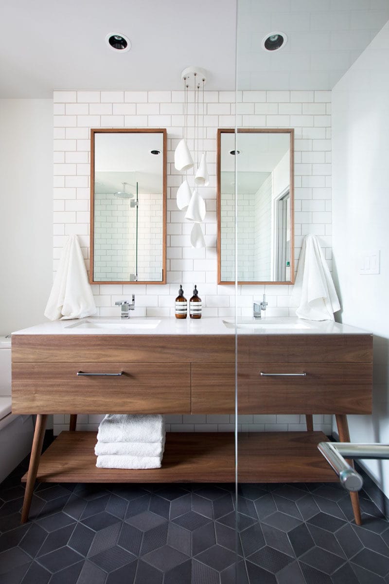 This bathroom includes two wood-framed mirrors. Do they not only ooze unmatched warmth but also develop a gorgeous symmetry. Floor and wall tiles steal the show.