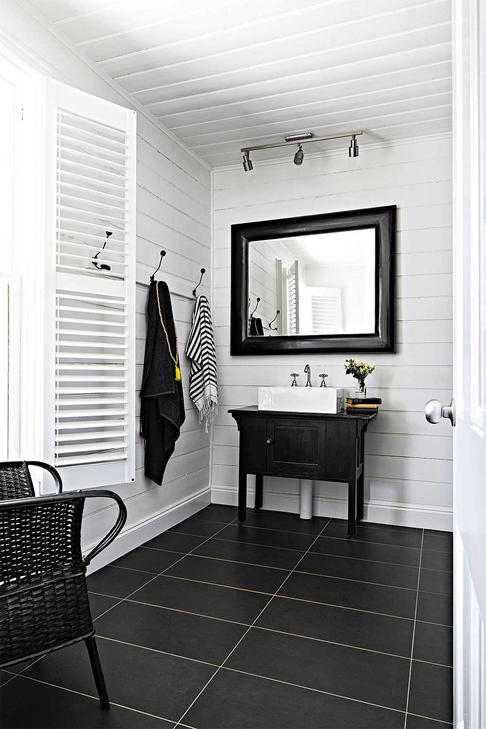 White shiplap ceiling and walls lead to a modern farmhouse bathroom. The mirror picks up the inky shade used throughout the space from rattan armchair to towel. It also matches the shape of the floor tile.
