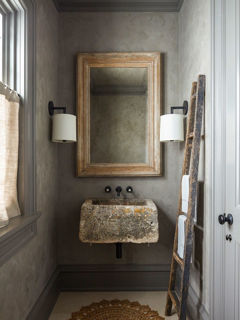 In this half bathroom, the distressed wood framed mirror perfectly teams with old ladder and weathered stone sink. It brings the rustic feel to the interior. Two vintage wall sconces light up the mirror and vanity.