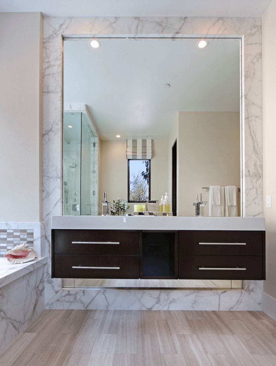 A floor-to-ceiling mirror has a marble frame. The unit sets a lavish setting and creates an impressive appearance at once. Not to mention, it offers a much-needed dimension.