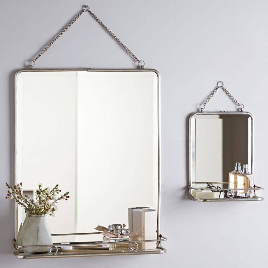 Here, the antique brass chains are used to suspend the mirrors. Even though the mirrors come in different sizes, they complement each other. Their shelves are the homes for flowers in vase, perfume, and eyeglasses.