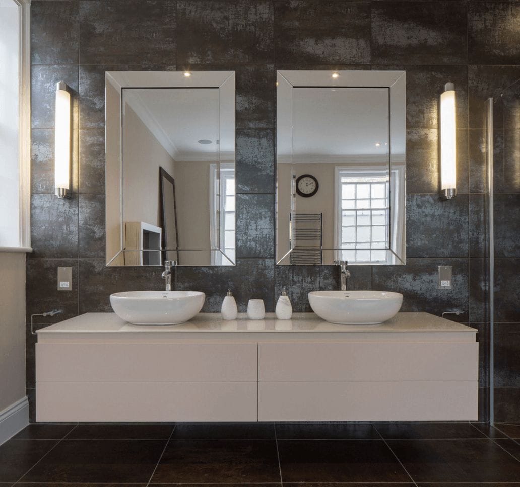 If your bathroom craves a visual balance, this idea is obviously for you. The mirrors with mirrored frames and saber wall sconces introduce a symmetrical appeal.