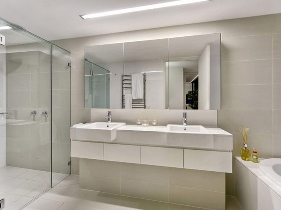 A wall light over the mirror continues the straight lines of the bathroom. It provides seamless illumination. Lastly, a glass shelf accommodates toothbrush holders.