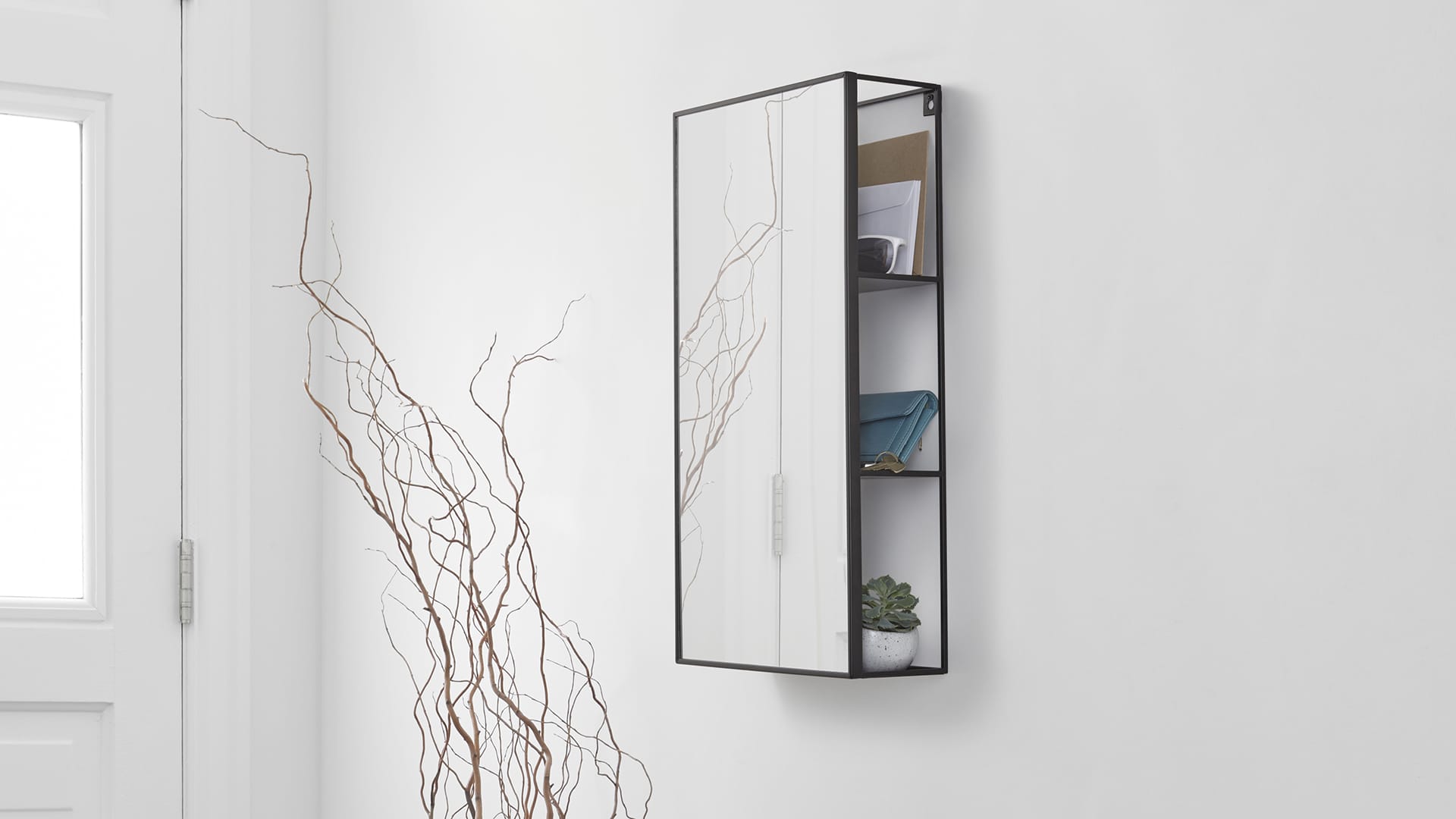 Then, install a narrow vertical mirror. The open shelves behind the mirror house potted plant and personal items. A black mirror frame and shelves lend the space a touch of eccentricity.