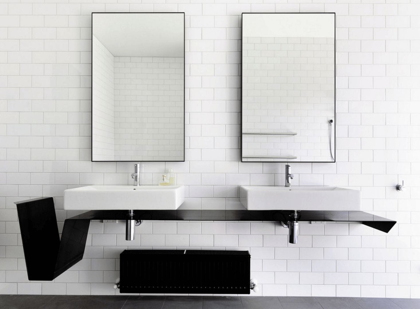 White subway tiled backsplash offers mesmerizing details to the bathroom. Double black-framed mirrors over white sinks command attention. They introduce an alluring contrast and a modern appeal.