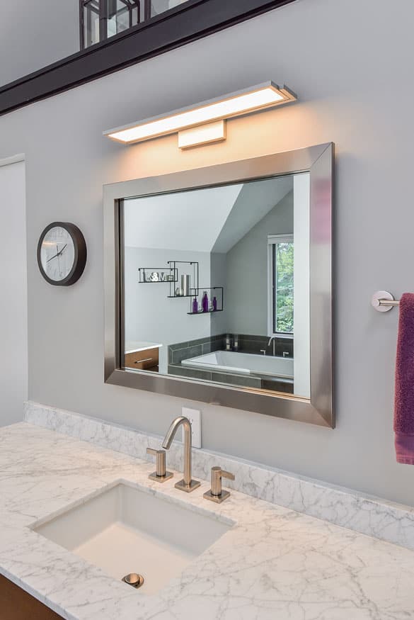 The mirror, vanity, and linear ceiling light stamp modern style. An oval soaking tub balances out well-defined lines and sharp edges.