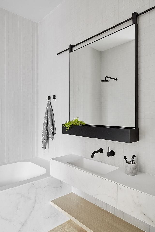 The pure white wall makes a crisp backdrop. Meanwhile, a black-framed rectangular mirror produces an edgy look and a modern feel.