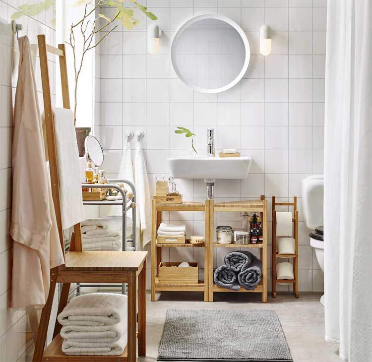 The pieces accommodate towels, glass containers, wicker baskets, and decorations.