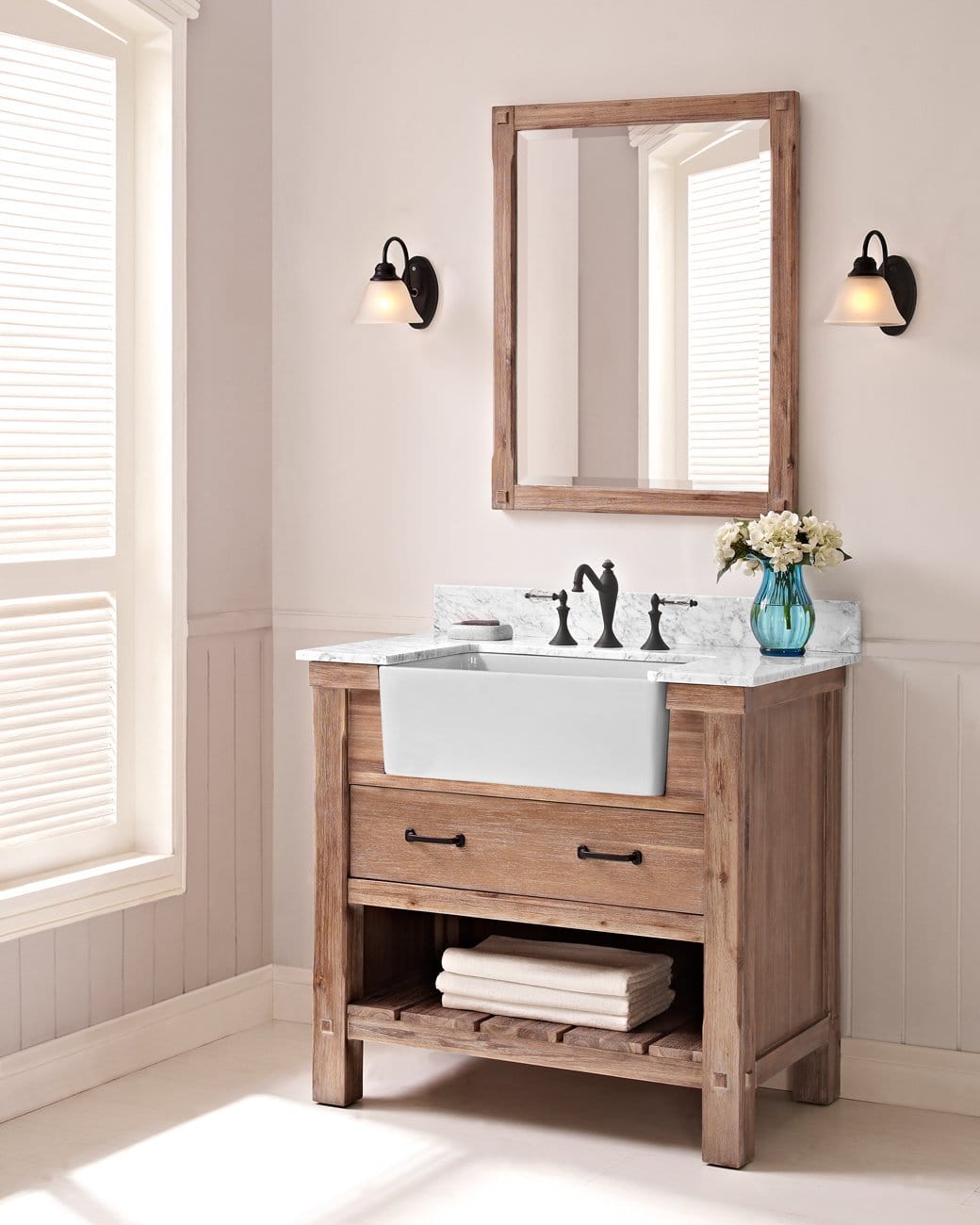 The unpainted wood vanity includes an open shelf and drawer with iron pulls. Both vanity and mirror look outstanding in a muted color palette. Faucet, apron-front sink, and wall sconces exude modern farmhouse charm.