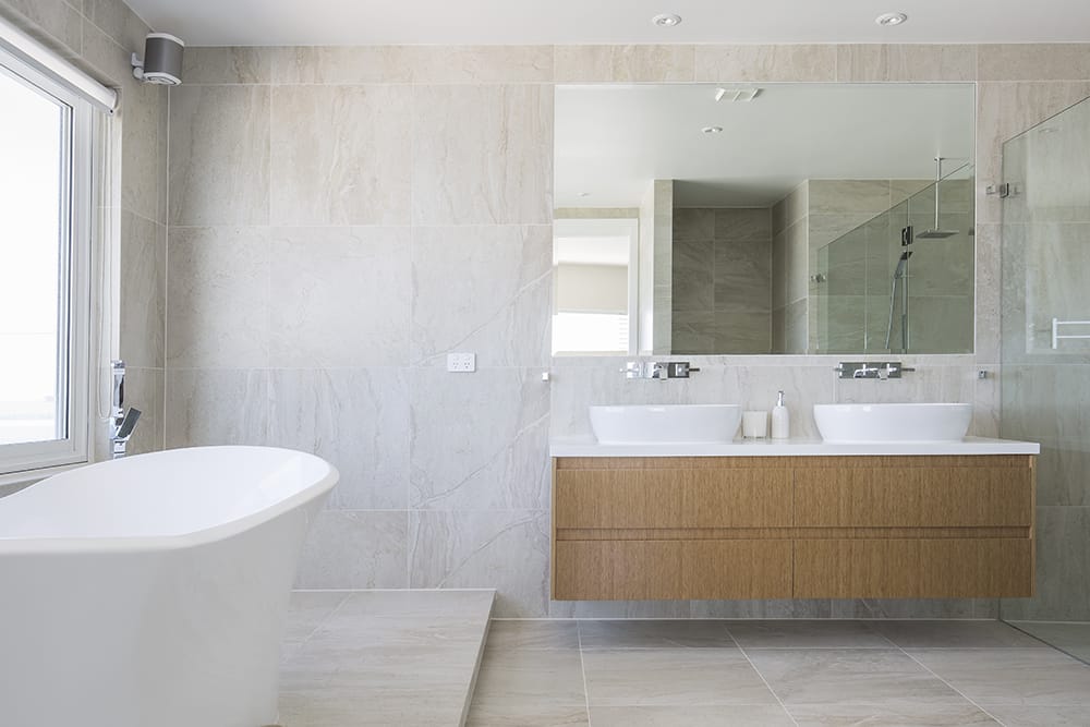 This bathroom is perfect for a couple. It boasts two sinks and illuminates a full-width mirror. Therefore, they do not battle for space anymore.