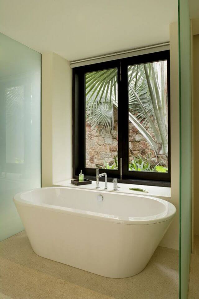 Square and rectangular-shaped glass windows are perfect to accommodate the white freestanding tub. They also bring jaw-dropping view and sunlight inside.