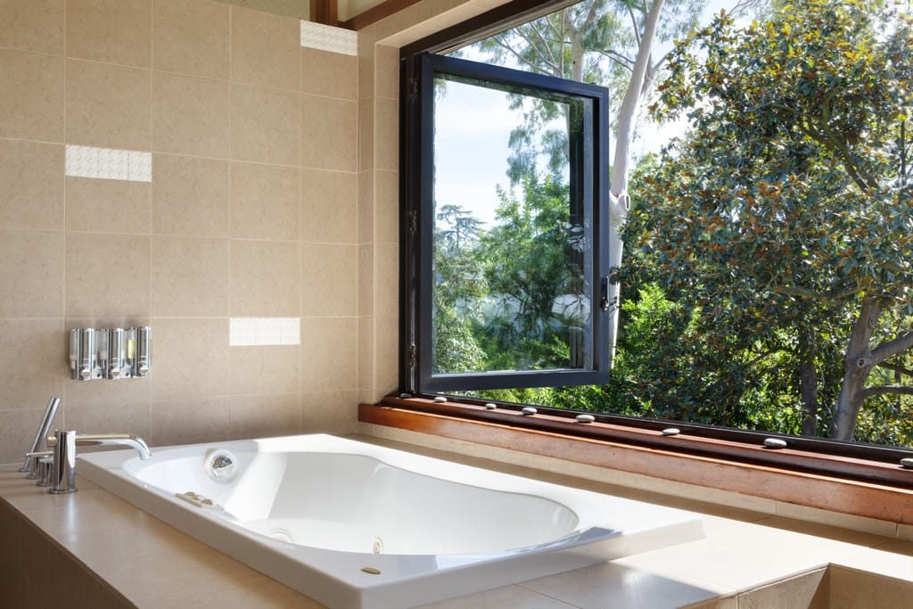 The black casement window adds high contrast to the space. A white freestanding soaking tub is adjacent to it. Therefore, the homeowner can admire the outside view.