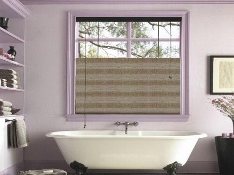 A clawfoot tub looks enchanting against lilac backdrop. The two-tone striped blind covers the lower portion of the bathroom window. It helps the space get sunlight without sacrificing homeowner’s privacy.