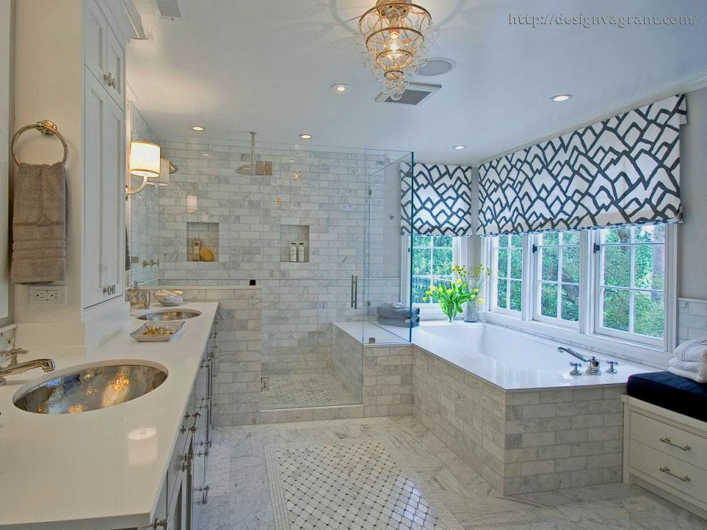 Pure and off whites keep the bathroom feel light as well as inviting. The wooden ladder shelf and stool rival metallic elements. Burlap shades do not just embellish the large windows, but also deliver a rustic vibe.