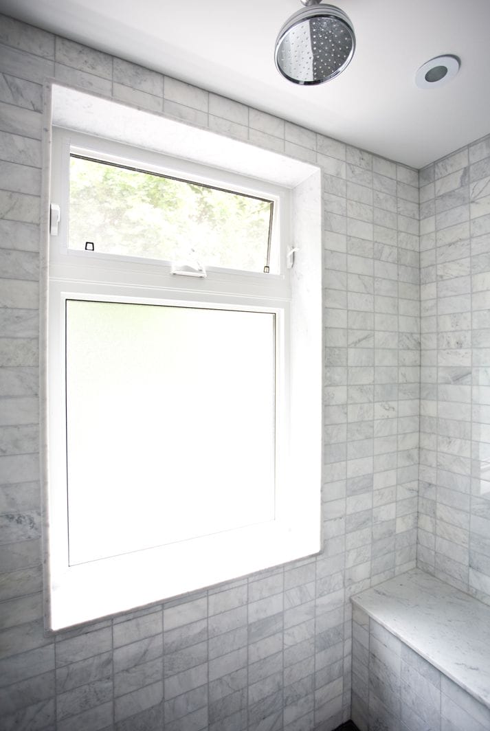 Marble floor and walls carry splendor to the bathroom. The opaque window film is an easy way to get instant privacy. Waterproof Roman shade exudes a feeling of softness in no time.